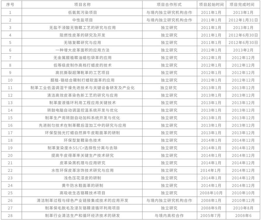 “Systematic Clean Production Technology of Leather” has been listed as a National Spark Program. “Research and Development on Recycling Tanning Clean Production Technology” project has won the third prize of the first “Innovation Award for Energy Saving, Emission Reduction and Environmental Protection in China Leather Industry”.
